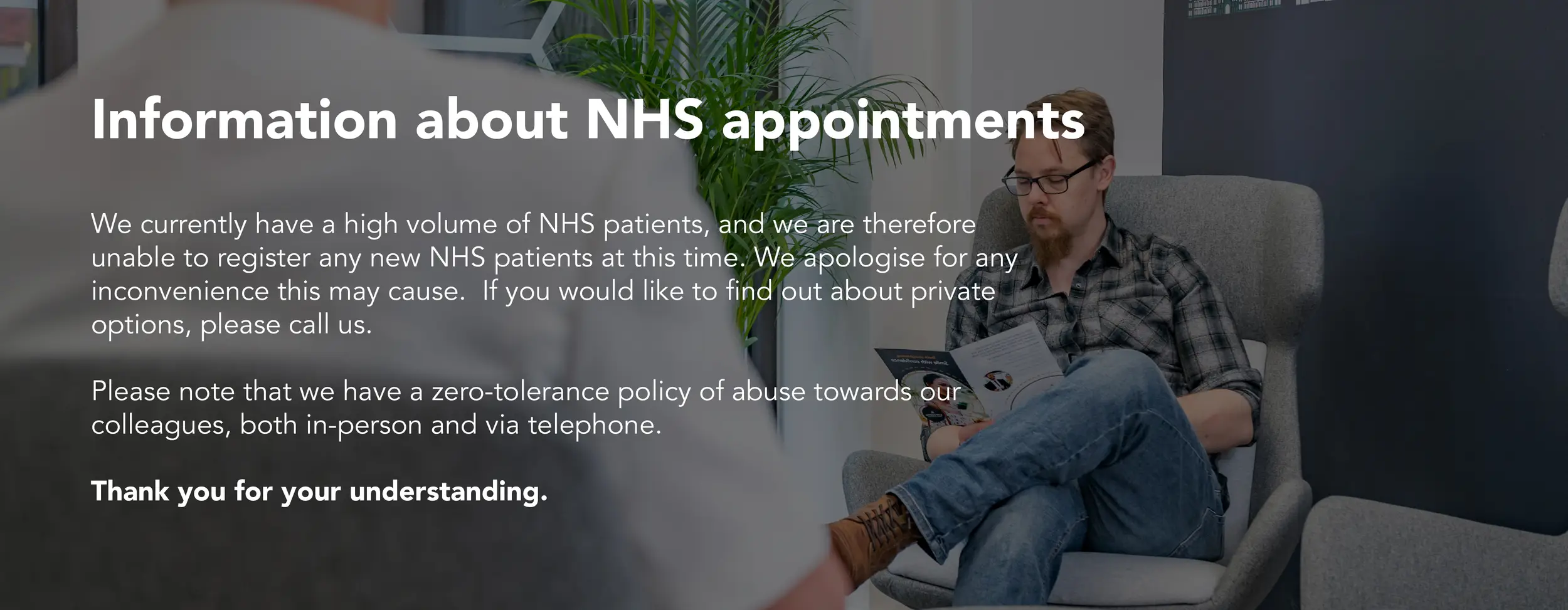 We currently have a high volume of NHS patients, and we are therefore unable to register any new NHS patients at this time. We apologise for any inconvenience this may cause. If you would like to find out about private options, please call us.